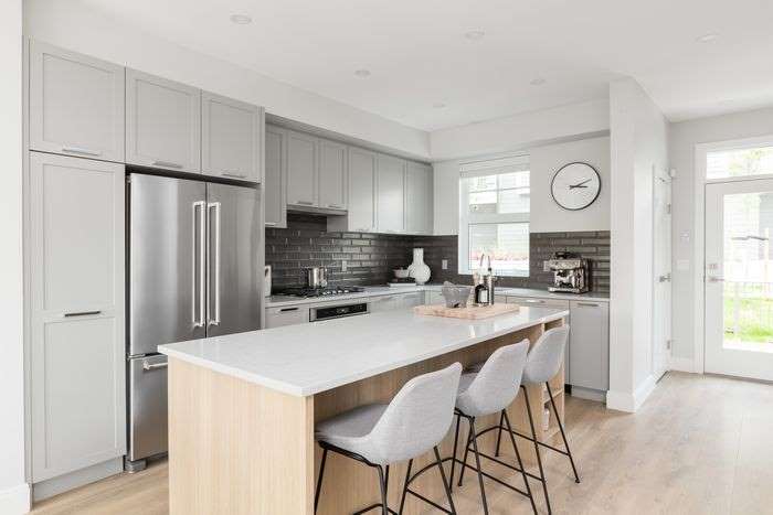 Homebuyers can choose from two colour schemes, appropriately named Mountain and River. The Mountain scheme has tones of lighter taupe-grey paired with darker oak-look laminate floors, white Shaker-style cabinets (flat panel wood-look in the island) and quartz countertops. The cabinetry in the River palette is grey, complemented with light oak-look laminate flooring.
