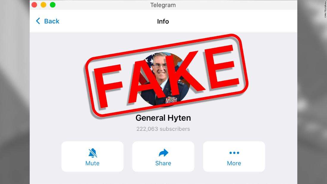 A spokesperson for Gen. Hyten told CNN Tuesday morning that the account is “an absolute fake” and added the Pentagon was “actively working” to get it taken down. Tuesday afternoon the account was marked as a “scam” with the message, “Warning: Many users reported this account as a scam or a fake account.” The account has since shed some followers, and many of the messages have been removed. A Telegram spokesperson told CNN, “Telegram monitors reports and warns users about fraudulent accounts in clear-cut cases like the one you pointed out. ” Facebook and Twitter did not immediately respond to requests for comment.